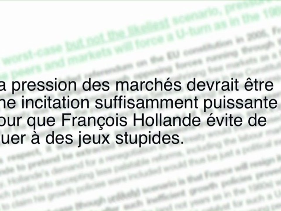 « François Hollande va avoir à naviguer à travers des forces dans la gauche, notamment à cause du référendum manqué de 2005, et dans cette perspective, vous écrivez, il serait politiquement intelligent que ses pairs de l’eurozone, ses partenaires allemands, belges italiens et ainsi de suite, permettent à François Hollande de prétendre qu’il leur a arraché quelques concessions, même si c’est faux en réalité. La demande de renégociation du traité serait alors utilisée pour tromper le public français, pour rouler – j’ai lu to ‘trick’ : rouler, tromper – pour tromper le public français, en lui faisant accepter des réformes convenables, dont celle du marché du travail. »
